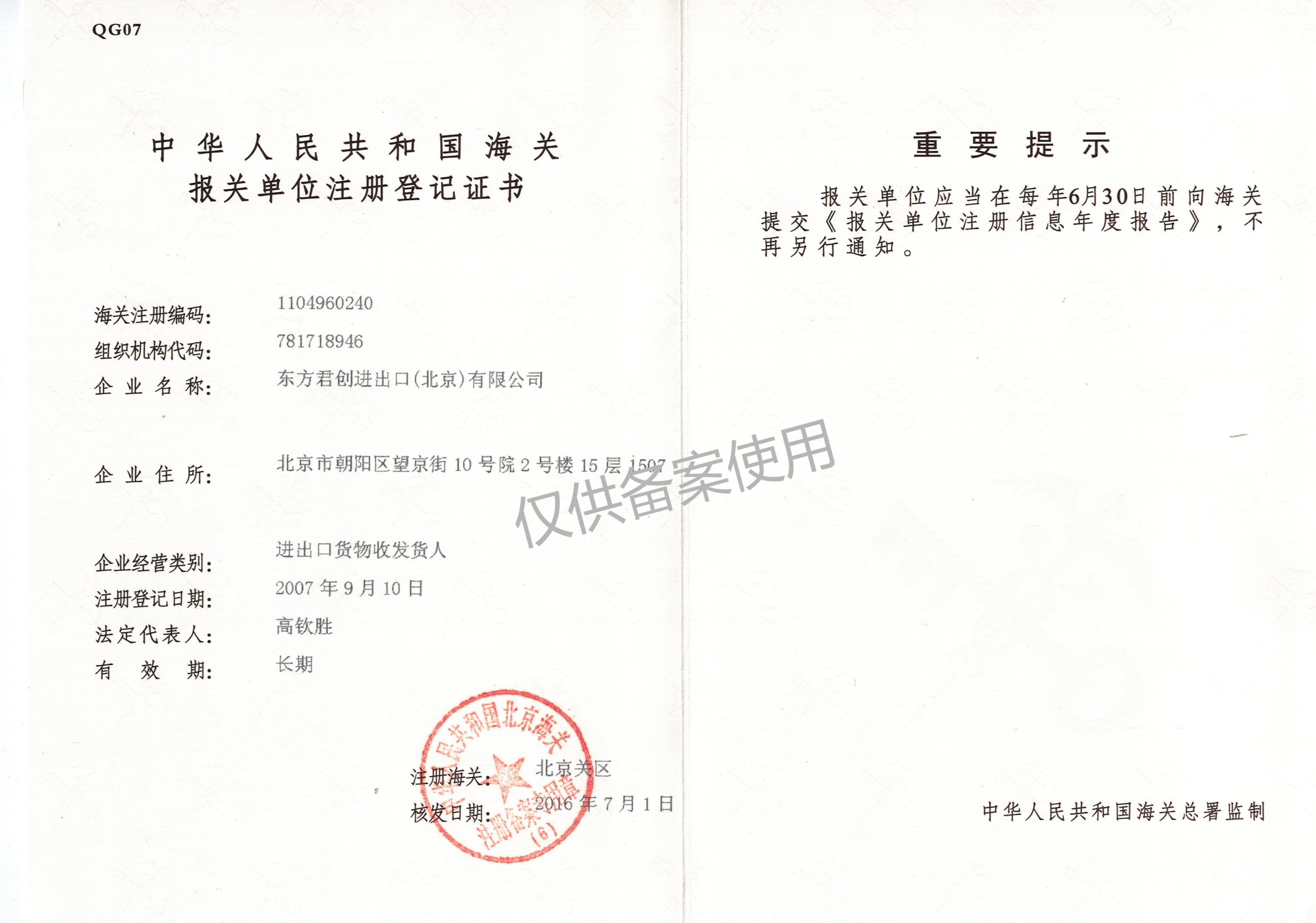 东方君创海关注册登记证书